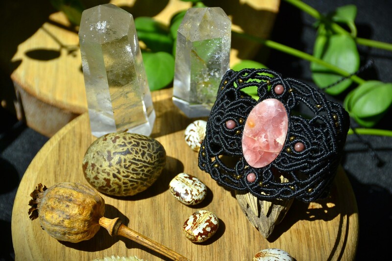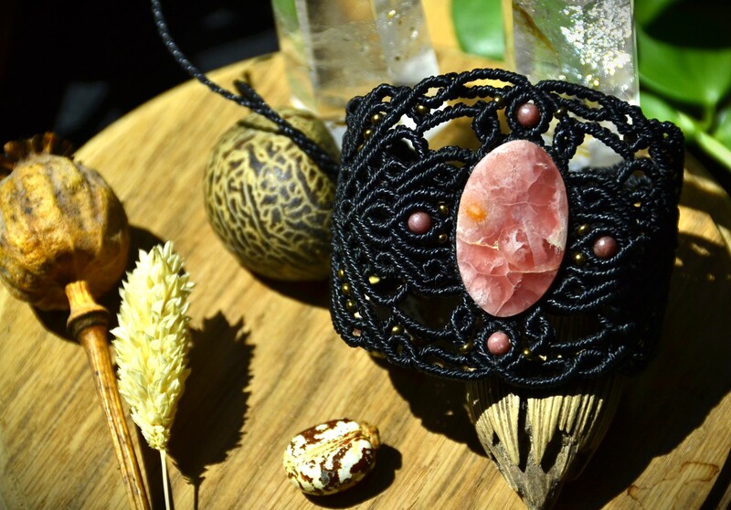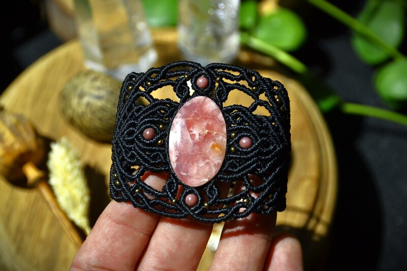 Bracelet Manchette avec une magnifique pierre rose de Rodochrosite, traviallé avec la technique de macrame en couleur noir.